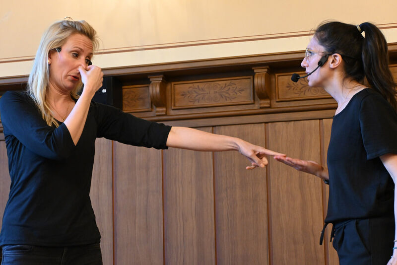 Das Publikum hat viele Variationen des Improvisationstheaters kennen gelernt, etwa ein „Freeze“, bei dem sich immer zwei Personen auf der Bühne befinden und die drei sich schnell abwechseln. Beim „Reigen“ spielen die Mimen immer eine feste Figur, aber sie treten in unterschiedlichen Konstellationen auf. Daraus wurde dann eine wilde Geschichte um einen Mann, der eine neue Freundin hat und diese dann die Ehefrau mit Hilfe stinkender Füße aus dem Haus vertreibt.