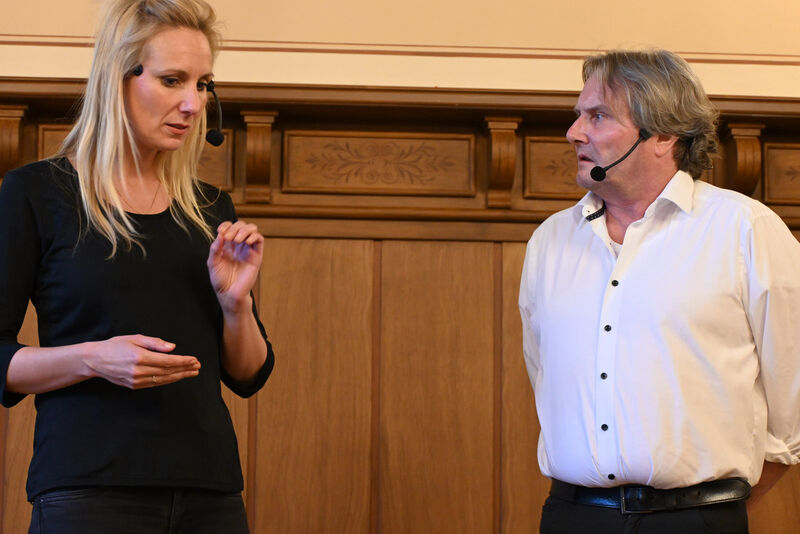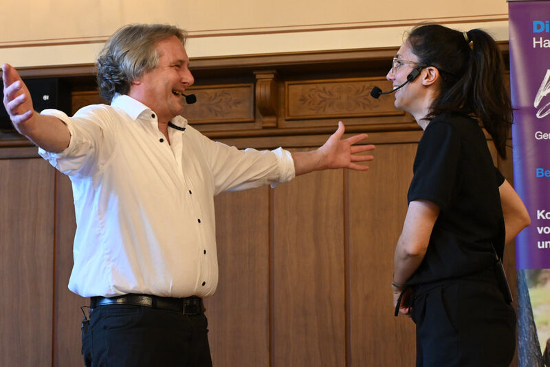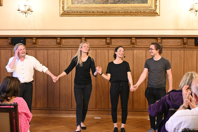 Von Anfang an sprang der Funke über: Die Improkokken haben das Publikum begeistert mit ihrem Improvisationstheater beim Fest der Stiftung proDiakonie im Jagdschloss Springe. Die rund 60 Gäste erlebten einen Abend voller neuer Geschichten, die vor ihren Augen und Ohren erst entstanden sind. Mit Stichworten aus dem Publikum oder von verstreuten Zetteln auf der Bühne haben Nike Andersen, Marc Beinsen, Mareike Schlote und Musiker Marco Benducci improvisiert in allen Variationen. Aus den Begriffen Park, Maus, Schlange, Geld und Falsch parken wurde eine urkomische Geschichte. In Sekundenbruchteilen lassen sich die Schauspielerinnen auf neue Situationen ein. Auf „Sie haben falsch geparkt“ wurde „Ich habe einen SUV, ich kann überall parken“. Die Wortreigen ließen beim Publikum immer wieder viel Applaus und La-Ola-Wellen aufbranden.