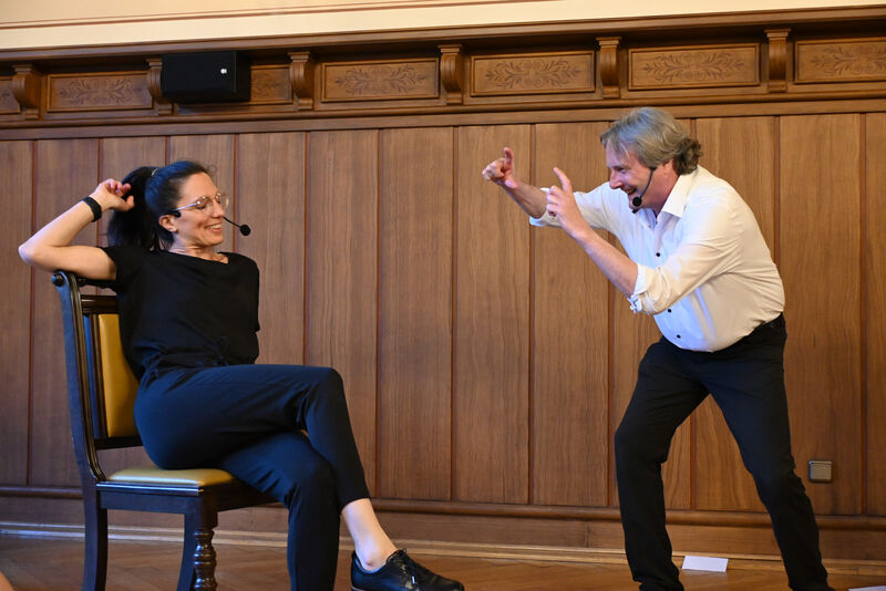 Die auf der Bühne liegenden Zettel müssen in einer anderen Variante des Impro-Theaters immer mit eingebaut werden, was zu absurden Dialogen führt – zum Vergnügen des Publikums. Ein Beispiel: „Wenn ich die zehn Eier gegessen habe, kann ich das elfte dann ausbrüten?“ „Ich wollte dich eigentlich erste nach der Konfirmation fragen.“ Das ganze Spiel wurde kongenial ergänzt durch Marco Benducci, der auf dem Keyboard immer passende Musikuntermalungen findet und mit Geräuschen unterstützt.