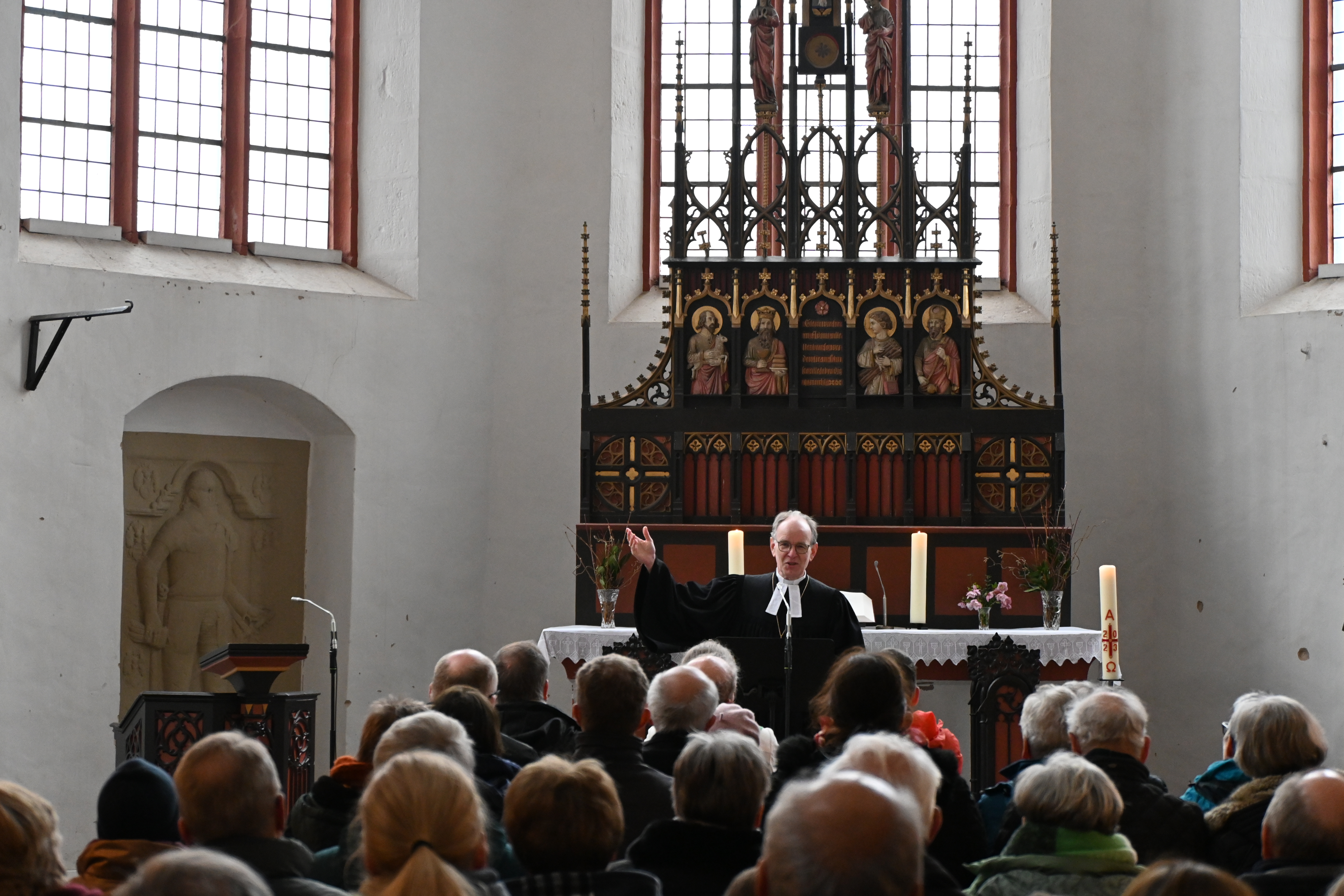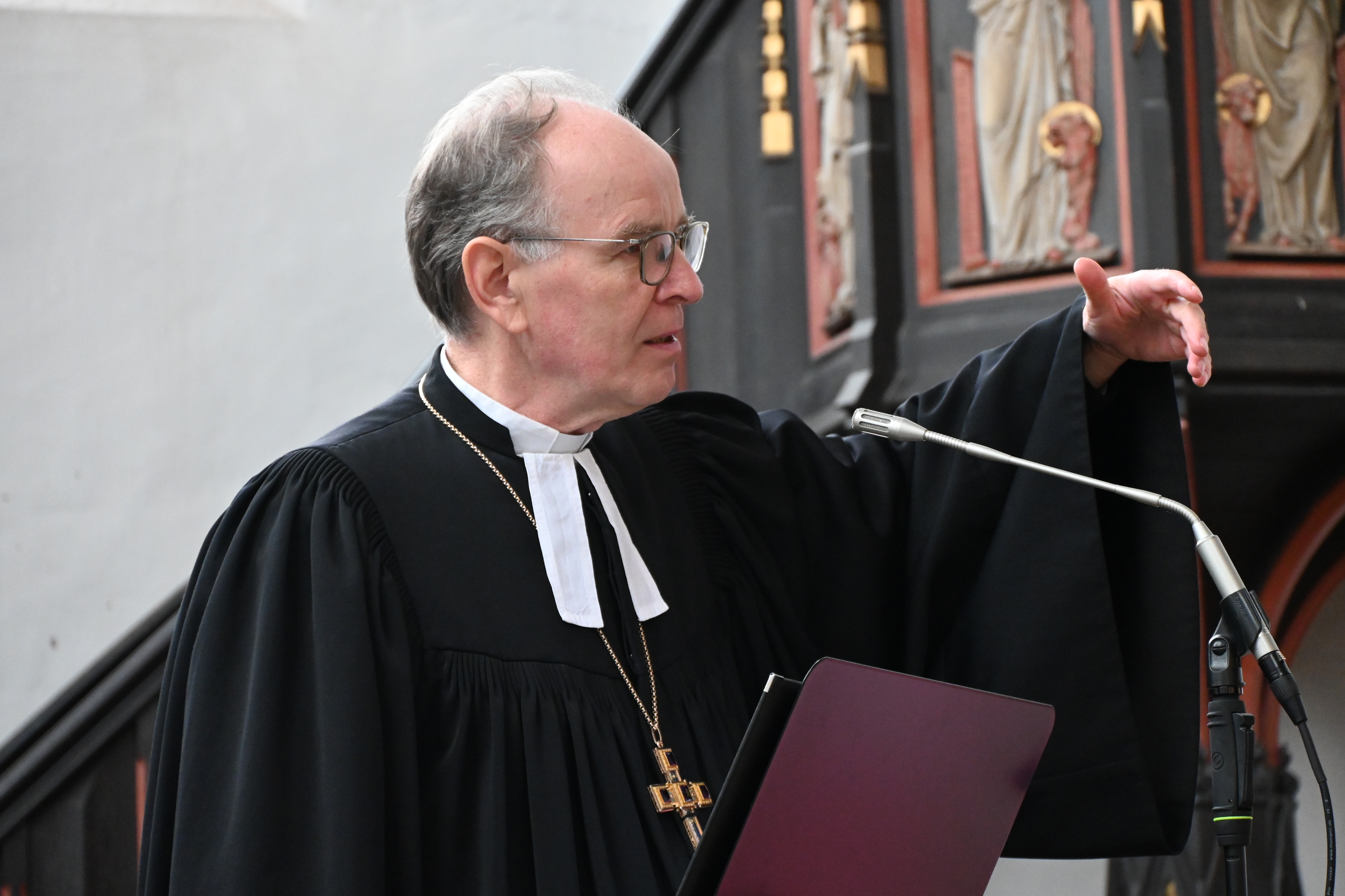 „Mein ausdrücklicher Wunsch war es, in der kleinsten Kirchengemeinde der Evangelisch-lutherischen Landeskirche Hannovers zu Gast zu sein, um Sie am Kirchentagssonntag zum Deutschen Evangelischen Kirchtag herzlich einzuladen“, sagte Landesbischof Ralf Meister gleich zu Beginn des Gottesdienstes. 45 Gemeindemitglieder gehören aktuell dazu, seit Mitte 2023 ist sie ein Teil der Gesamtkirchengemeinde Eldagsen und Finiendörfer. „Nun bin ich hier“, sagte Meister. Die Klosterkirche St. Marie und Willehad ist dem Landesbischof seit mehr als 10 Jahren von außen bekannt, denn: „Ich gehöre zu den Radfahrern.“ Aber nach mehreren anstrengenden Kilometer habe er den Abzweig zur Kirche auf der grünen Anhöhe nie genommen.
