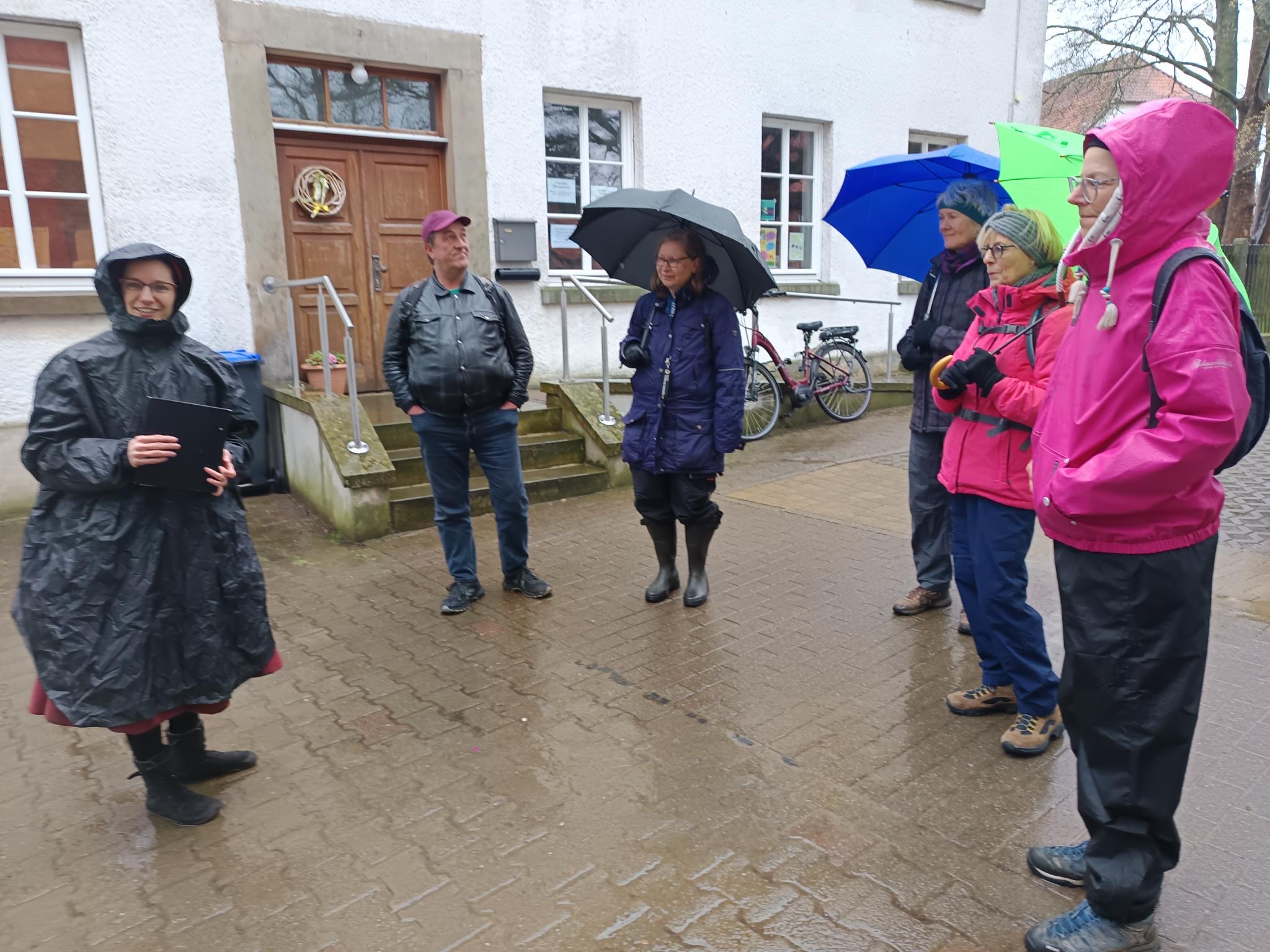 Trotz strömenden Regens und Kälte waren einige Menschen gekommen, um gemeinsam einen Pilger-Gottesdienst zu feiern. Nach der Begrüßung und einem Gebet an der Gestorfer Kirche machten wir uns auf den Weg.