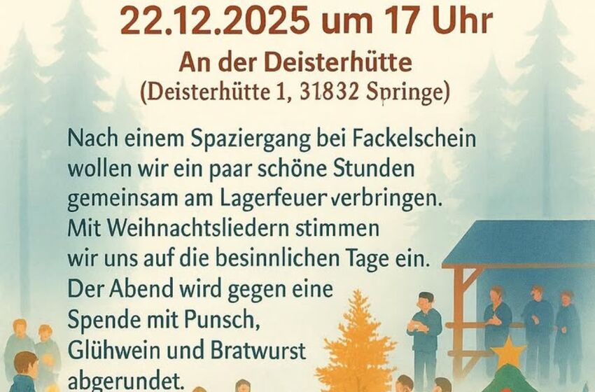 Am 22.12. 25 ist es wieder soweit. Die evangelische Jugend Springe veranstaltet die Waldweihnacht. Für alle Interessierten ist der Start um 17 Uhr an der Deisterhütte. Es sind ausdrücklich alle ...