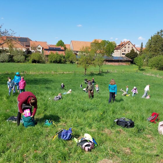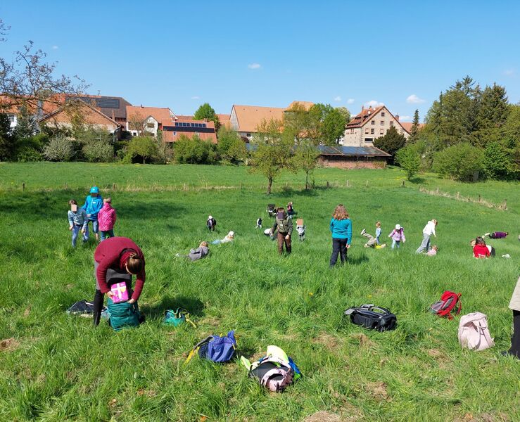 Unsere erste Station war auf einer abschüssigen Wiese. Hier kugelten die Kinder voller Freude herunter. Auch der Weg der Emmausjünger führte bergab. Da passte diese Station prima!