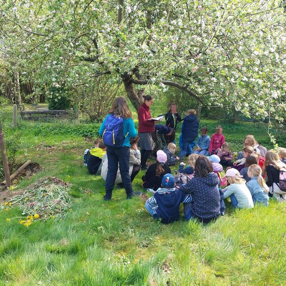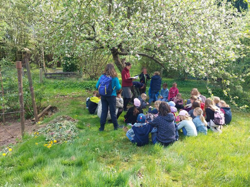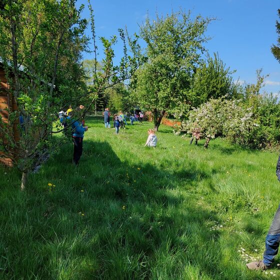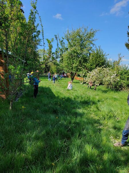 Als zweite Station konnten wir einen romantischen naturnahen Garten besuchen. Hier blühten die Bäume und Blumen um die Wette. Die Kinder durften mit Gesten oder Dingen aus dem Garten zeigen, was Jesus ihnen bedeutet. Es kamen spannende Bilder zusammen.