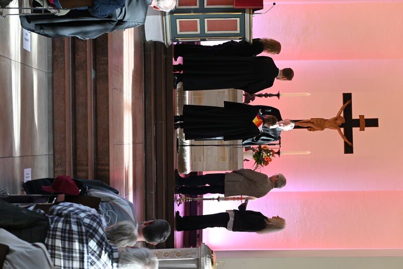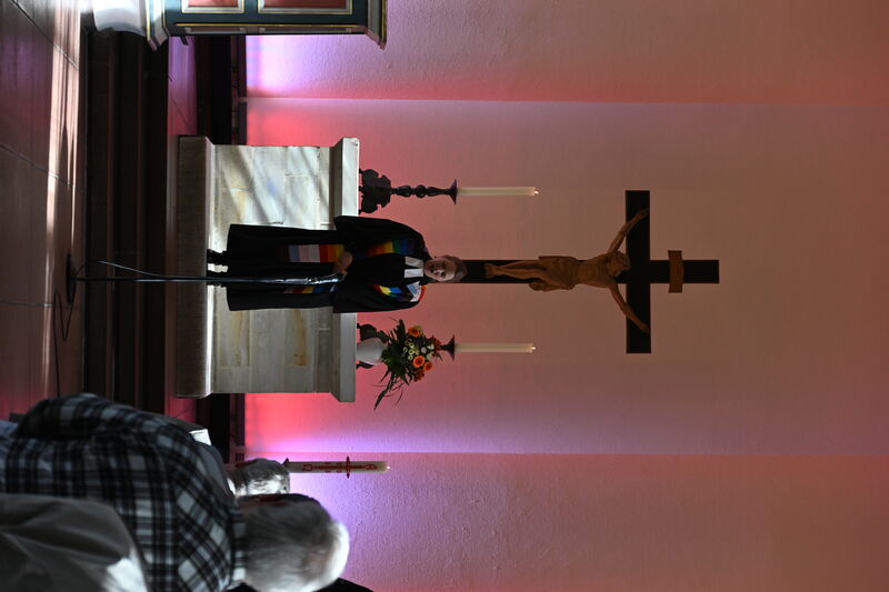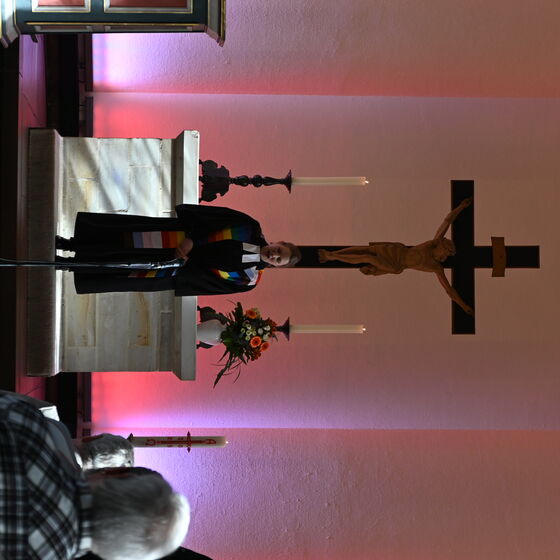 In ihrer Predigt stellte die neue Pastorin die Seligpreisungen vor und entdeckte darin tröstliche Zusagen, hohe Ansprüche, aber auch - passend zum Reformationstag - Luthers Rechtfertigungslehre. Glaube soll sich auch in tätiger Nächstenliebe zeigen, gleichzeitig ist es befreiend zu wissen, dass Christen durch den Glauben allein aus der Gnade Gottes gerechtfertigt sind. Auch wenn es auf den ersten Blick scheint, als könnten Menschen die Erwartungen der Seligpreisungen nicht erfüllen: Wie immer, wenn es um die Frage geht, wie Nachfolge Jesu aussehen kann, gibt es auch hier keine Erwartung der Perfektion. Eine besondere Beziehung hat Silke Fahl auch deswegen zu den Seligpreisungen, weil „Selig sind die Friedfertigen; denn sie werden Gottes Kinder heißen“ ihr Taufspruch ist. Nach der Predigt wurde passenderweise „Mercy is falling“ gesungen.