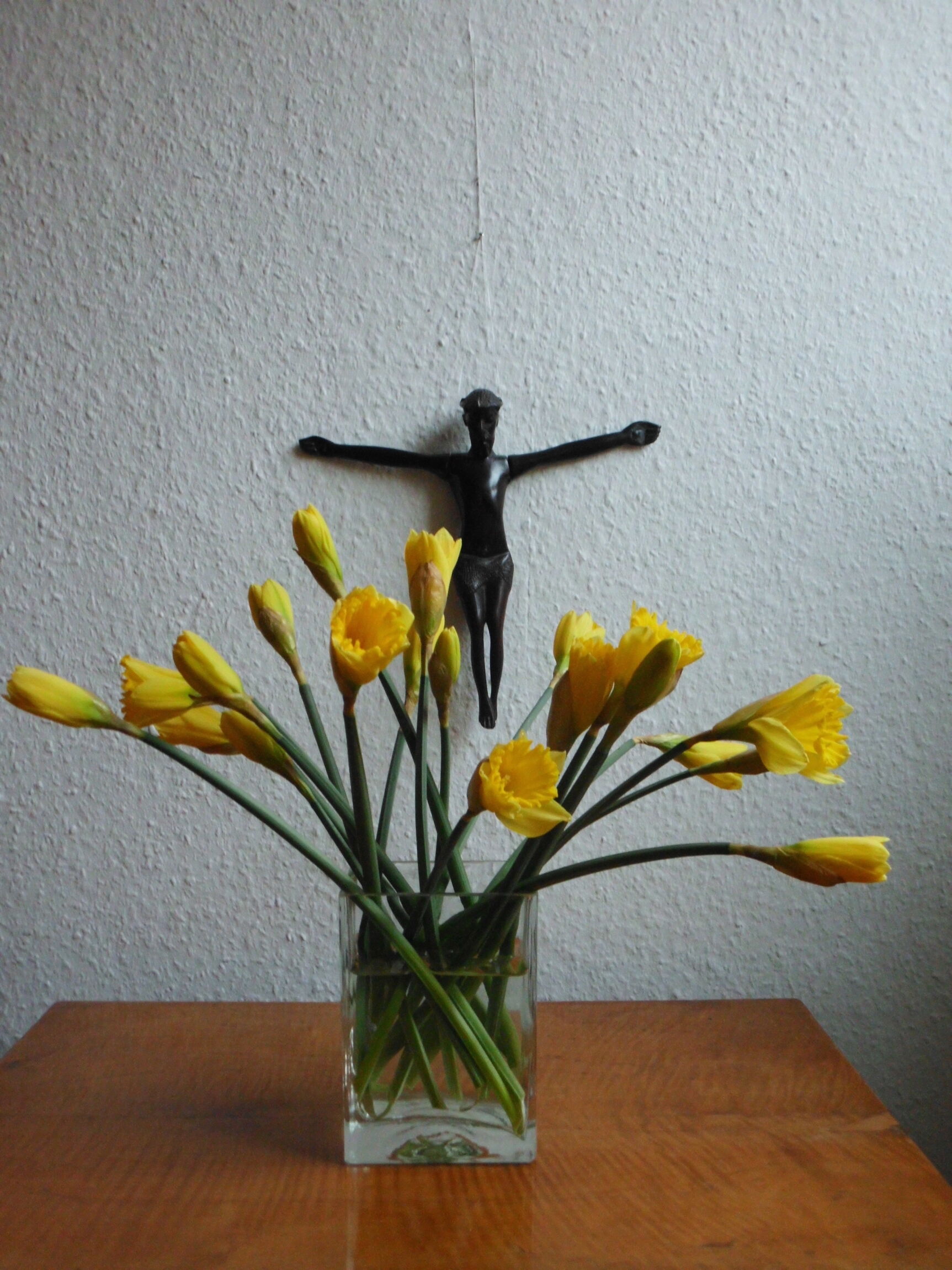Die Narzissen und das Kreuz – sie erinnern mich an den Spruch, mit dem Martin Luther die Lutherrose (s.u.) erklärte, das Wappen, das er sich gewählt hatte: