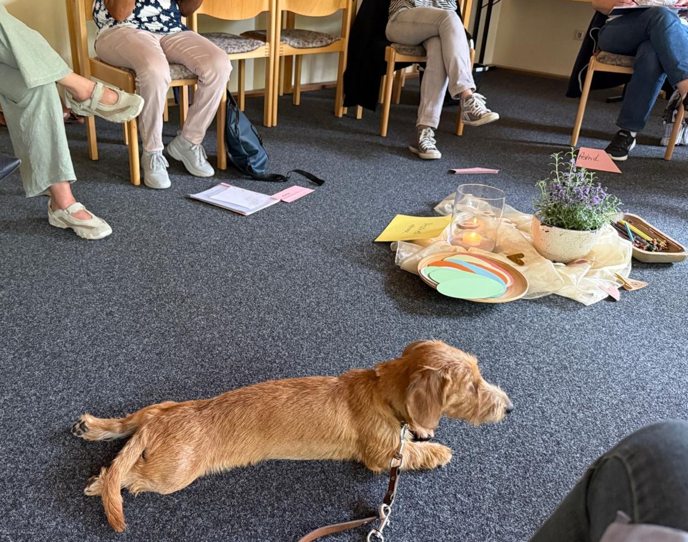 Aber wir lernen ständig dazu. Und wir haben uns Hilfe geholt. Von Fridemann. Das ist ein Zwergdackel, den ich oft bei der Hospizarbeit dabeihabe. Er hat inzwischen auch eine Ausbildung als Begleithund genossen. Er hat kein Problem mit Kommunikation. Denn er kann einfach durch sein Dasein das Gefühl von Wärme und Nähe vermitteln. Manchmal lenkt er auch ab von Schmerzen oder schweren Gedanken. Das alles schafft er ohne ein einziges Wort, einfach nur durch Bewegung und Gesten. Er kennt keine gesellschaftlichen Barrieren oder Vorurteile. Er lebt einfach immer im Hier und Jetzt. Zudem ist er auch für einen Dackel sehr klein und schüchtert niemanden ein. Trotzdem ist er eine bereichernde Persönlichkeit.