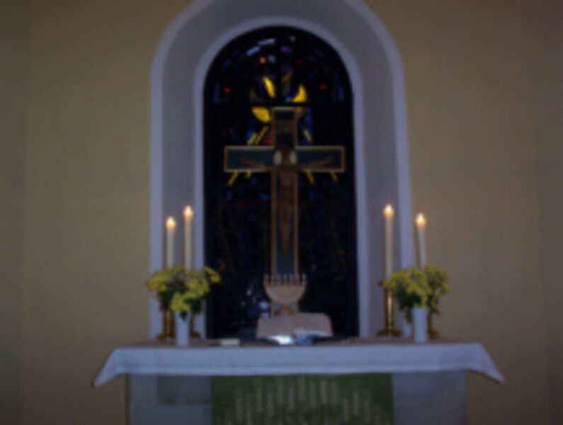 Schenken Sie bitte Ihre Aufmerksamkeit auch den in jüngster Zeit gestifteten Skulpturen: der Bronzeskulptur “Vergebung” im sog. Gefallenenfenster und der Holzskulpturen-Gruppe “Maria” und “Johannes” zu beiden Seiten des Altars.