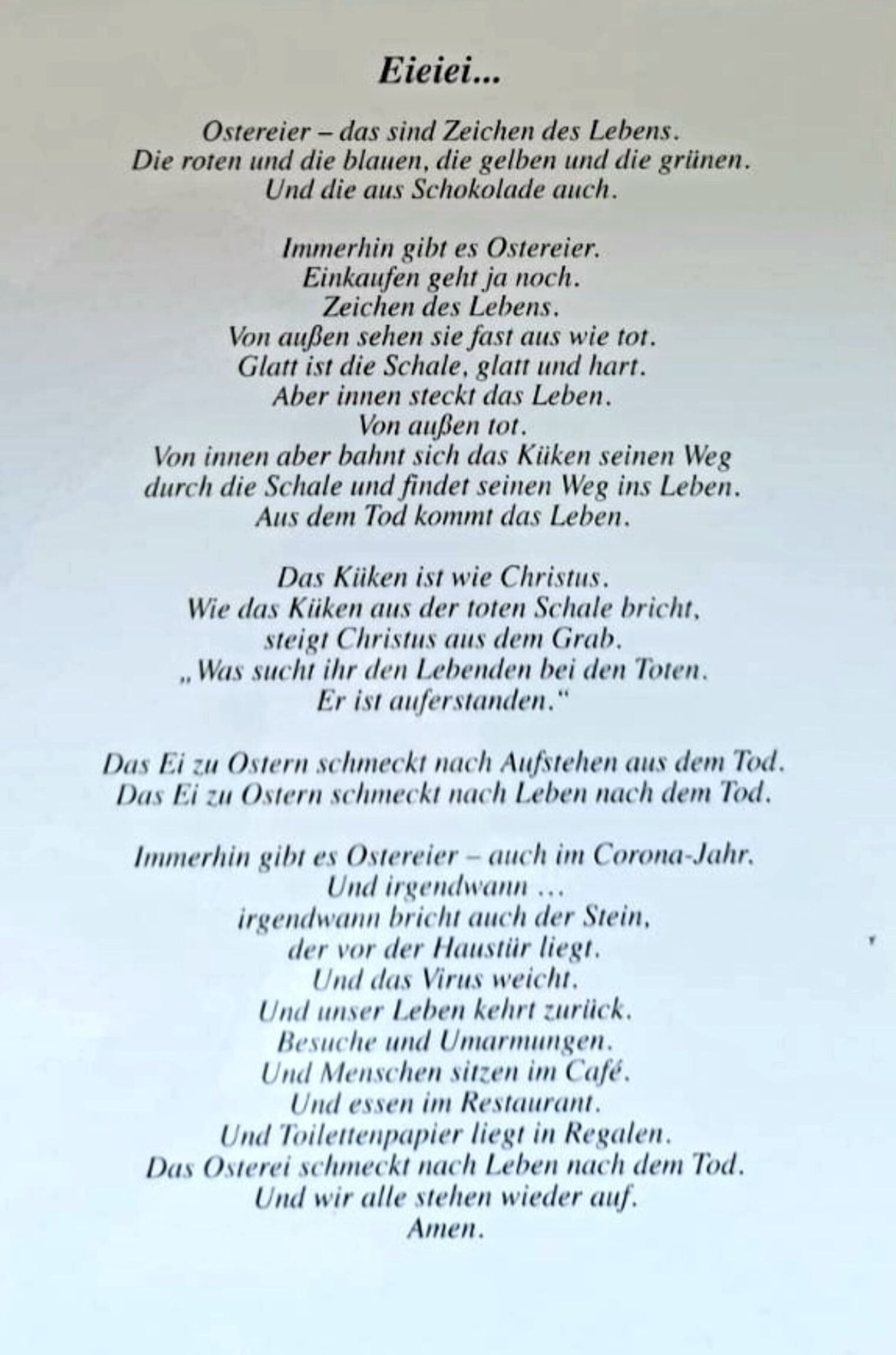 Und als der Sabbat vergangen war, kauften Maria Magdalena und Maria, die Mutter des Jakobus, und Salome wohlriechende Öle, um hinzugehen und ihn zu salben. Und sie kamen zum Grab am ersten Tag der Woche, sehr früh, als die Sonne aufging. Und sie sprachen untereinander: Wer wälzt uns den Stein von des Grabes Tür? Und sie sahen hin und wurden gewahr, dass der Stein weggewälzt war; denn er war sehr groß. Und sie gingen hinein in das Grab und sahen einen Jüngling zur rechten Hand sitzen, der hatte ein langes weißes Gewand an, und sie entsetzten sich. Er aber sprach zu ihnen: Fürchtet euch nicht! Ihr sucht Jesus von Nazareth, den Gekreuzigten. Er ist auferstanden, er ist nicht hier. Siehe da die Stätte, wo sie ihn hinlegten. Geht aber hin und sagt seinen Jüngern und Petrus, dass er vor euch hingeht nach Galiläa; da werdet ihr ihn sehen, wie er euch gesagt hat. Und sie gingen hinaus und flohen von dem Grab; denn Zittern und Entsetzen hatte sie ergriffen. Und sie sagten niemand etwas; denn sie fürchteten sich.