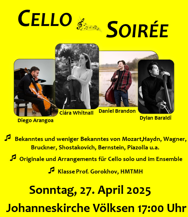 Am Sonntag, 27. April 2025 spielen um 17.00 Uhr Ciára Whitnall, Daniel Brandon, Diego Arangoa und Dylan Baraldi, vier Mitglieder der Celloklasse von Prof. Leonid Gorokhov aus der HMTMH.