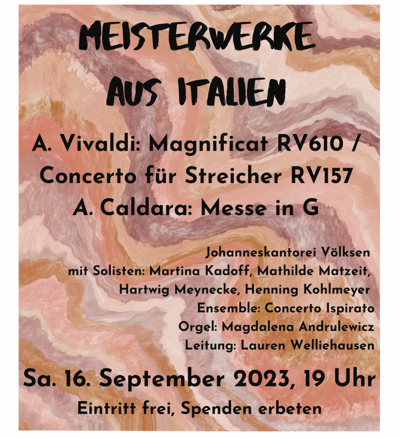 Die Johanneskantorei führt Werke von Antonio Vivaldi und Antonio Caldera auf. Begleitet wird sie von Gesangs-Solist:innen, der Kreiskantorin von Laatzen-Springe sowie dem Ensemble Concerto Ispirato, das auf Barockinstrumenten spielt.