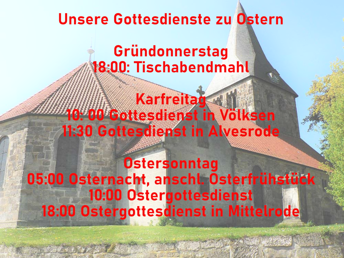 Um 10:00 findet der Ostergottesdienst mit Abendmahl in Völksen statt. Zum Gottesdienst in Mittelrode um 18:00 auf Hof Kramer laden das Vorbereitungsteam, der Mittelroder Gesangsverein und der Posaunenchor Völksen ein. Im Anschluss entzündet die Feuerwehr das Osterfeuer.