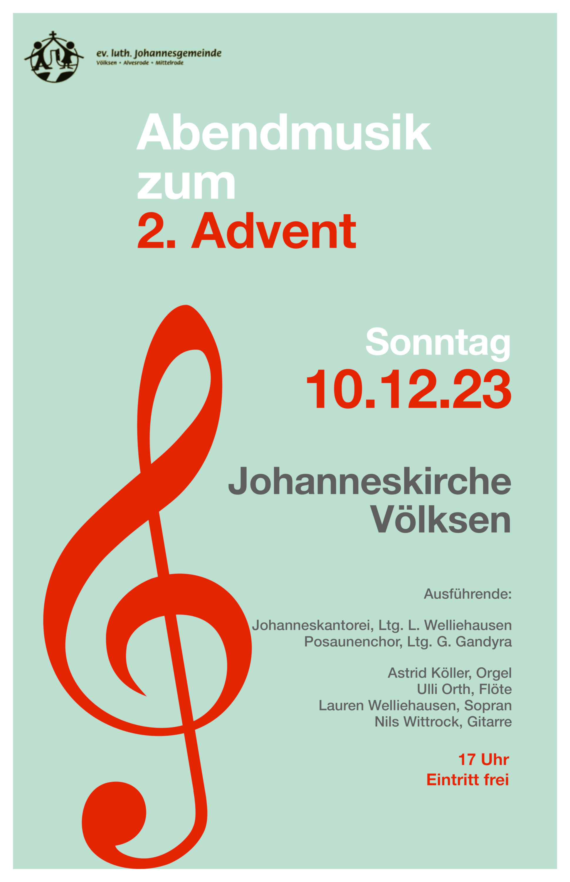 Wir veranstalten wieder unsere traditionelle Abendmusik am 2. Advent. Die Musikgruppen der Gemeinde bringen Musik zum Advent zu Gehör. Dazu laden wir herzlich ein! Der Eintritt ist frei, es gibt eine Kollekte am Ausgang.