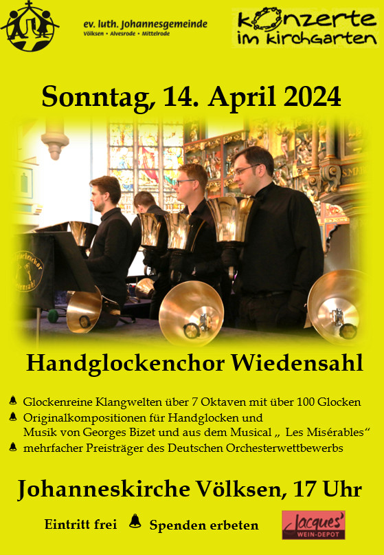 Seit der Gründung im Jahr 1987 hat sich der Handglockenchor Wiedensahl zu einem der größten und besten der ca. 40 Ensembles dieser Art in Deutschland entwickelt. Zum Musizieren stehen dem Chor über 100 große und kleine Handglocken und 61 Tonstäbe mit einem Tonumfang von insgesamt sieben Oktaven zur Verfügung. Die sonor bis hell klingende, obertonreiche Musik bietet ein den Meisten bisher nicht bekanntes Erlebnis. Ein Genuss in unserer akustisch dafür prädestinierten Johanneskirche!