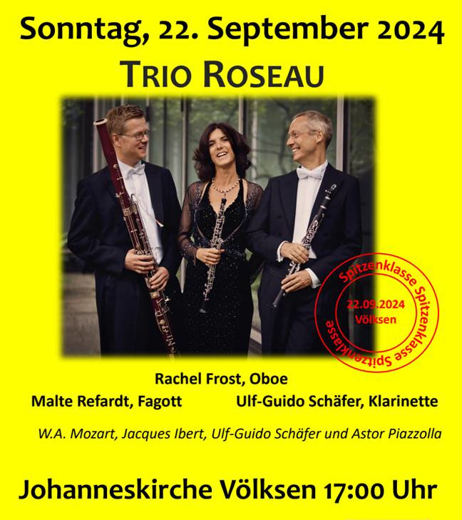 Mit großer Freude und Erwartung weisen wir auf das nächste musikalische Erlebnis in der Johanneskirche in Völksen hin: am Sonntag, 22. September 2024, kommen wir in den Genuss dreier international gefragter Musikerinnen und Musiker: Rachel Frost (Oboe), Malte Refardt (Fagott) und Ulf-Guido Schäfer (Klarinette) bilden zusammen das Trio Roseau (www.trioroseau.de).
