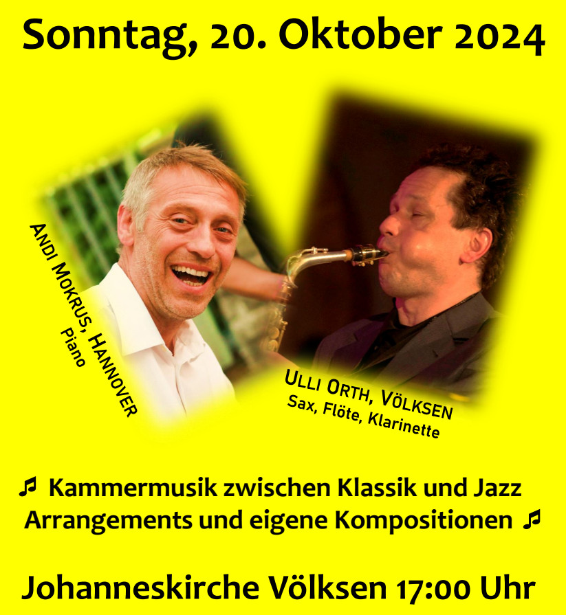 Bei ihrem letzten Gastspiel hatte das Duo unter dem Motto „Die Kunst der klassischen Improvisation“ bekannte klassische Kompositionen wie z.B. das Air von J.S. Bach oder den Liebestraum von Franz Liszt ausgewählt, um darüber zu improvisieren. In ihrem erweiterten Programm präsentieren Andy Mokrus und Ulli Orth nun neben besonderen „Schmankerln“ aus dem alten Programm neue Jazzkompositionen von Andy Mokrus, u.a. eine von ihm komponierte Neo Barocksuite und Originalkompositionen aus dem modernen Jazzbereich. Darüber hinaus wird der Zusammenhang zur Jazzimprovisation durch eigens erstellte Jazzsuiten über Kompositionen von George Gershwin und Duke Ellington hergestellt. Ein spannendes Hörerlebnis hochgradiger Kammermusik zwischen Klassik und Jazz zweier virtuoser Solisten!