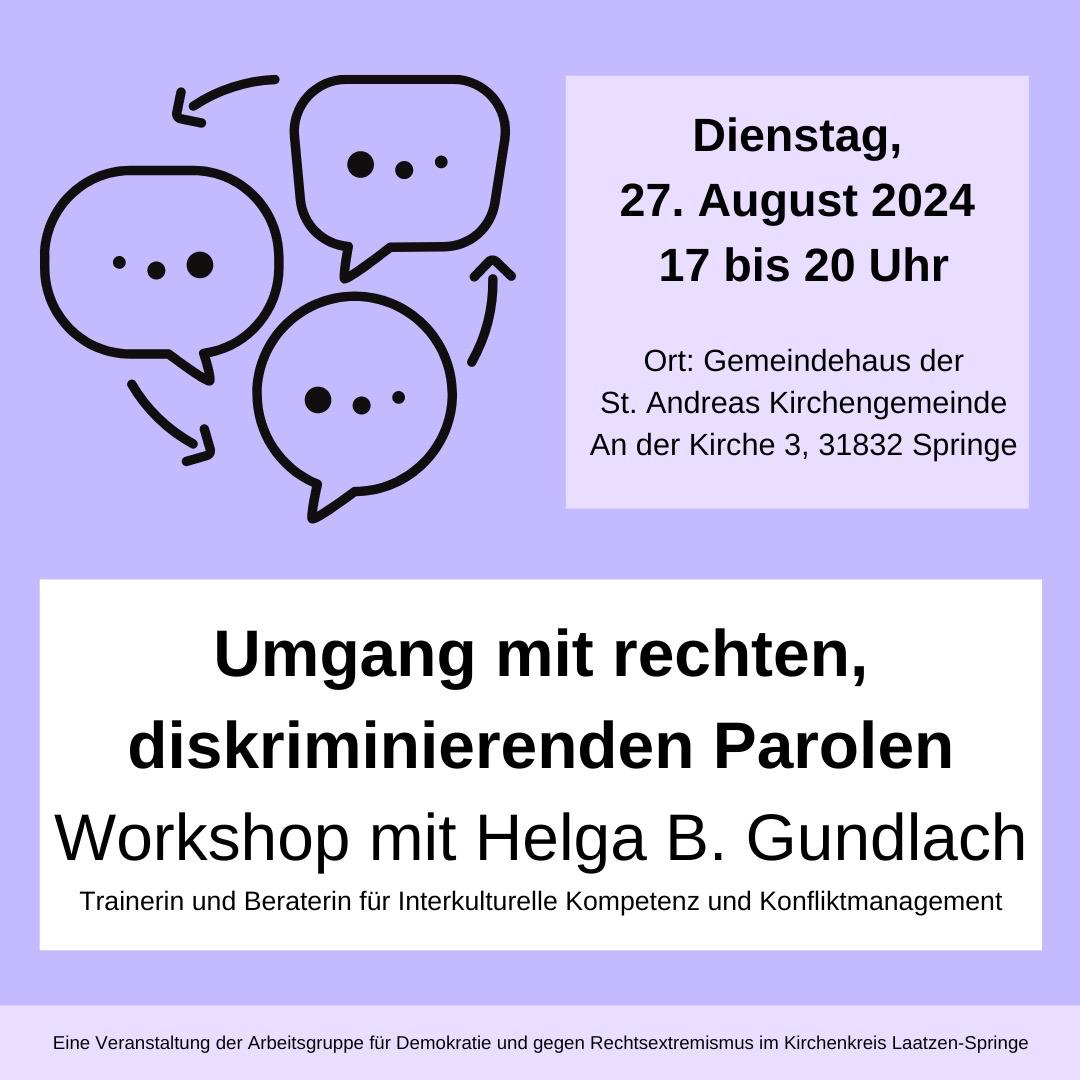 Deshalb laden wir Sie herzlich zu unserem Workshop „Umgang mit rechten, diskriminierenden Parolen“ in die St. Andreaskirche ein. Gemeinsam wollen wir Strategien gegen rechtsextreme und diskriminierende Parolen erlernen.