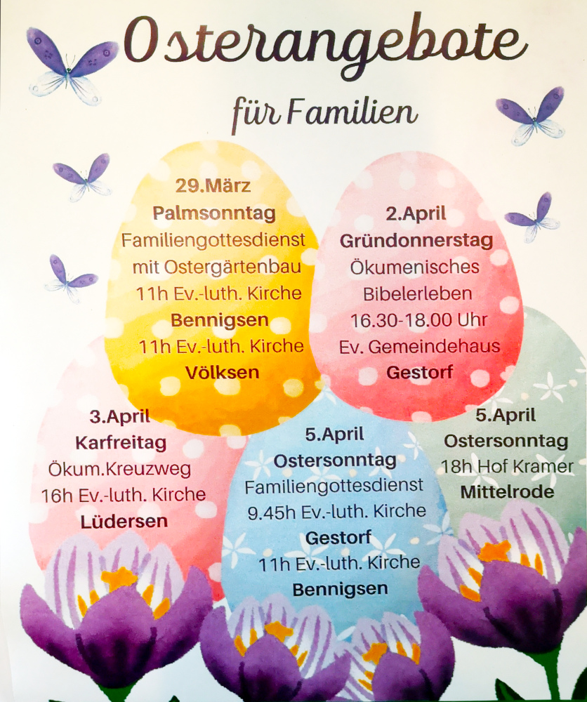 Am Gründonnerstag, dem 2.4.2026, haben Familien die Möglichkeit, an einem „Ökumenischen Bibel erleben“ teilzunehmen. Die Veranstaltung findet von 16.30 Uhr bis circa 18.00 Uhr im Evangelischen Gemeindehaus Gestorf (In der Welle 4) statt. Zu dieser Veranstaltung sind Kinder im Kindergarten- und Grundschulalter mit ihren Familien herzlich eingeladen. Das Programm sieht ein gemeinsames Feiern vor, bei dem die Teilnehmer die Geschichte des Gründonnerstags erleben. Außerdem wird gemeinsam gegessen.