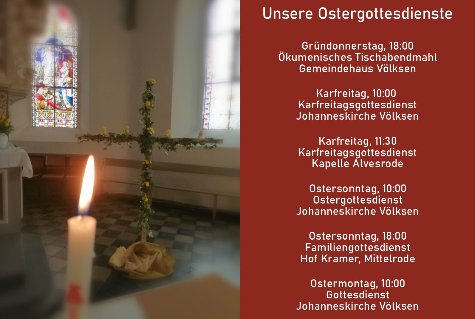 • Um 9.45 Uhr in der Ev. Kirche Gestorf (In der Welle 4) . An diesem Ort werden wir die Osterfeiertage verbringen und das Licht für unsere Ostergärten mitnehmen.