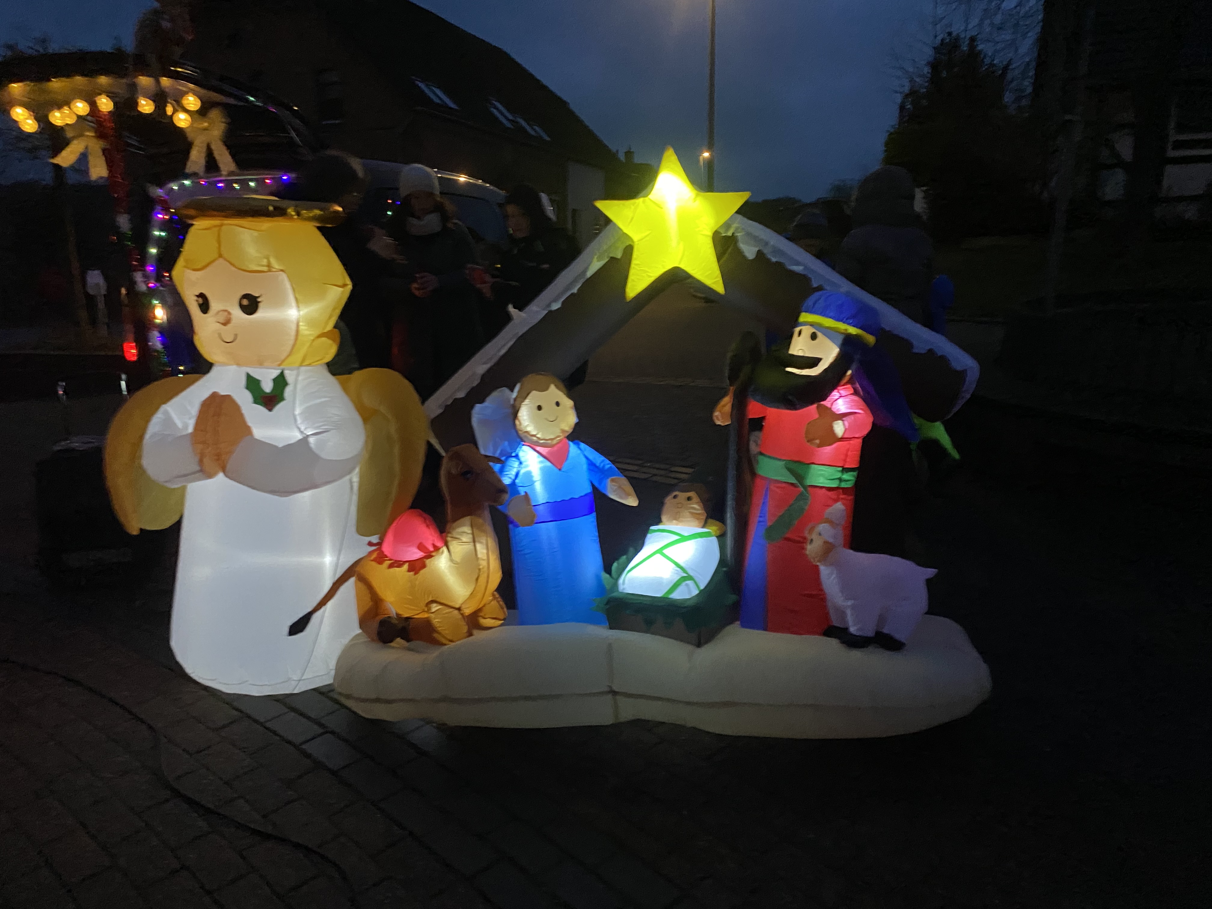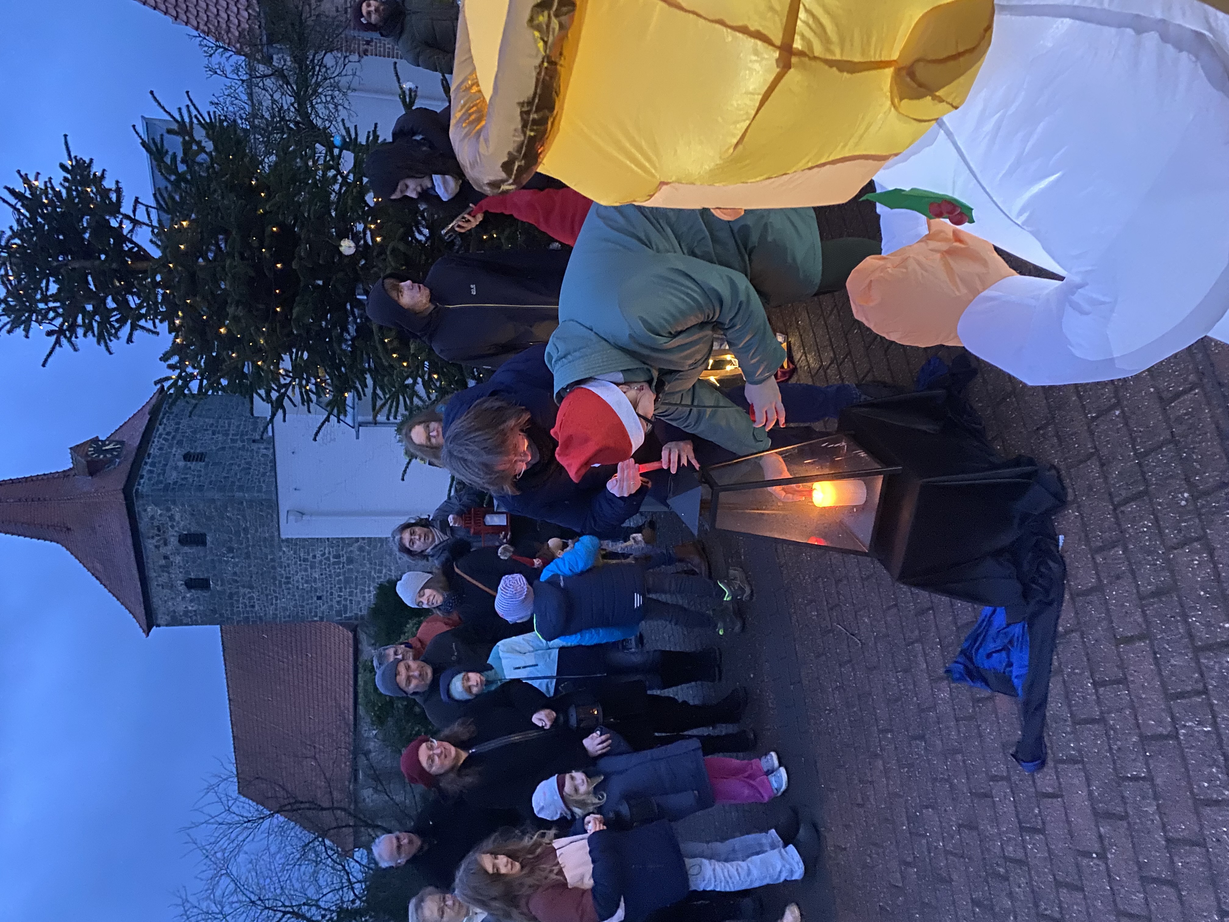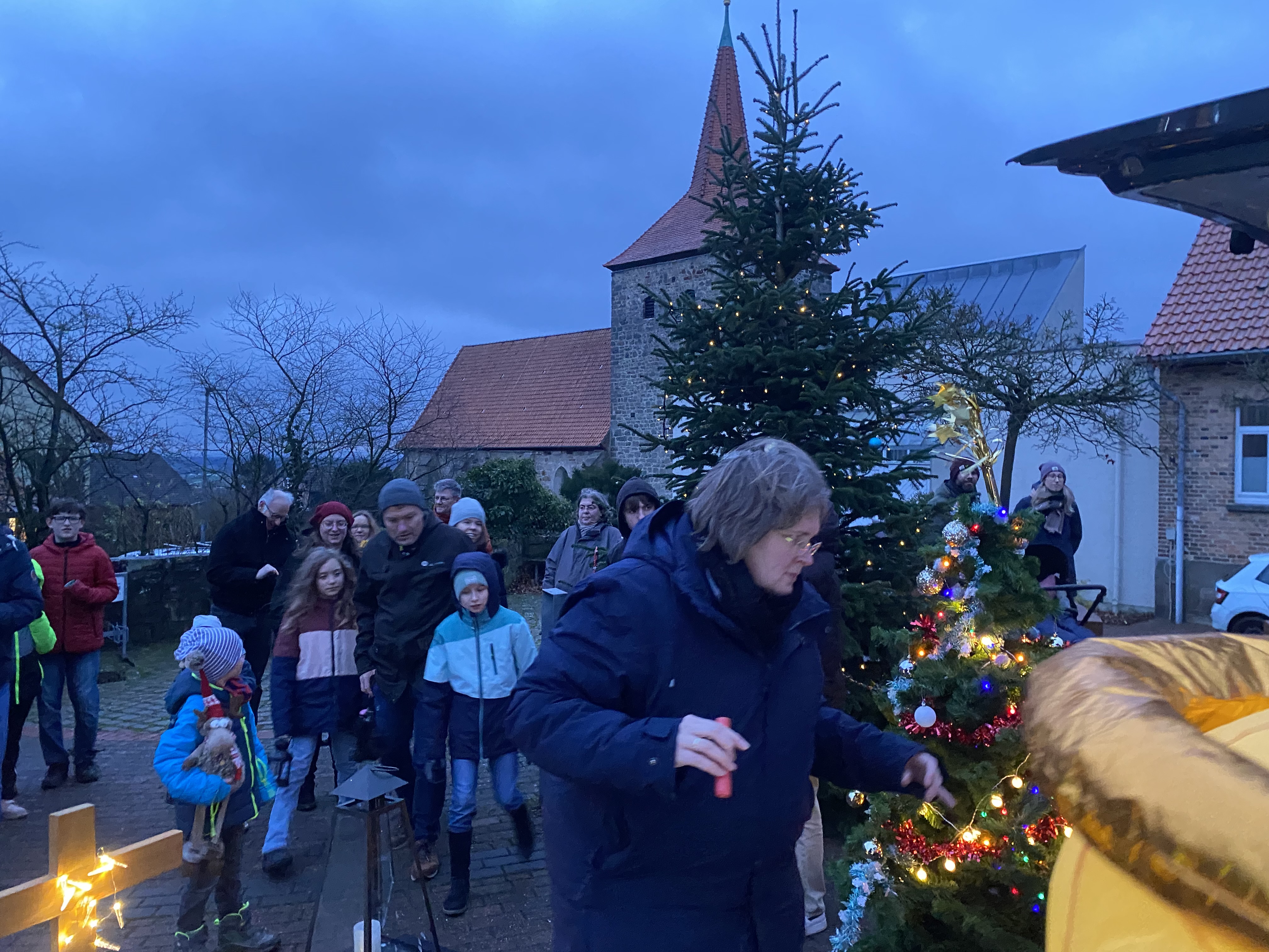 Kurz nach 16 Uhr am 3. Advent fährt der Adventsbully des KJD-Teams zu seiner 1. Station im Bergdorf Lüdersen auf dem Dorfplatz vor. Trotz Nieselregen und stürmischen Böen sind viele Kinder und Erwachsenen gekommen. Die Abenddämmerung hat längst eingesetzt. Und dann geht alles ganz schnell. Die Heckklappe öffnet sich und der Adventsbully erstrahlt auf einmal mit seinen kunterbunten Lichterketten den ganzen Dorfplatz. Hach, irgendwie magisch. Die drei Diakoninnen holen geschwind verschiedenste bunte und leuchtende Utensilien aus dem Bully. Was ist das eigentlich alles? Wir staunen. Ein buntes Paket wird plötzlich immer größer - es entpuppt sich als menschengroße aufblasbare Krippe. Ein anderes Paket ist ein großer aufblasbarer Engel. Wir sind überrascht und auch etwas verzaubert. Derweil frischt der Wind noch einmal so richtig doll auf. Aber das ist jetzt egal. Es wird improvisiert und alle packen mit an. Längst trällert die Adventsplaylist vom KJD über die Lautsprecher. Während die Einen sich schon gekonnt im Takt dazu bewegen, oder einfach nur mitsummen, halten die Anderen mit Händen und Füßen die Krippe & den Engel fest, so dass nichts wegfliegt. Wir sind verzaubert von dieser besonderen Stimmung.