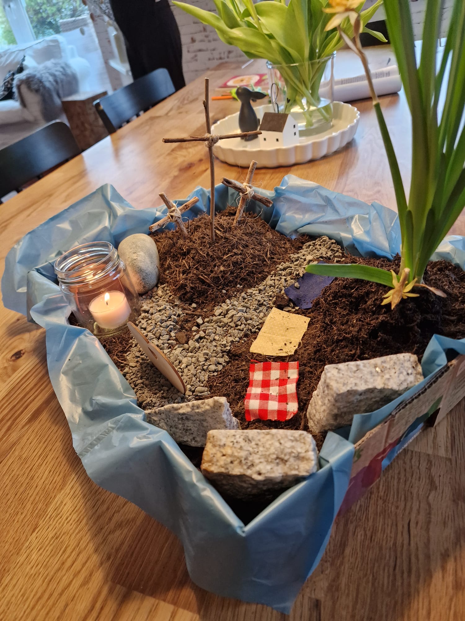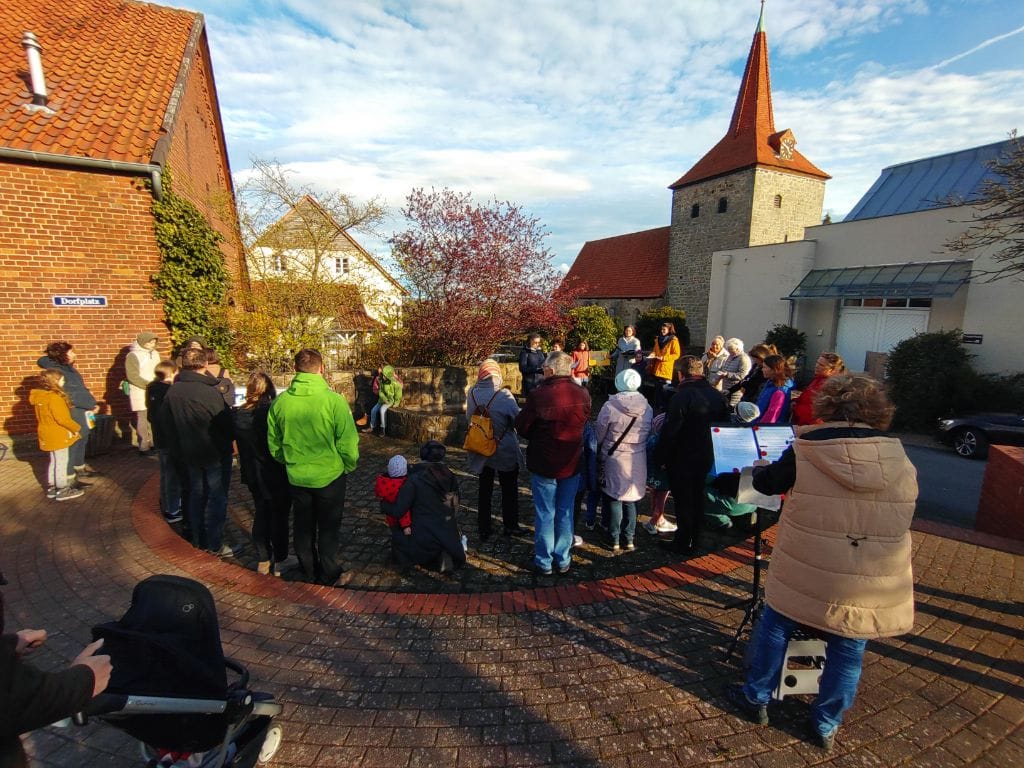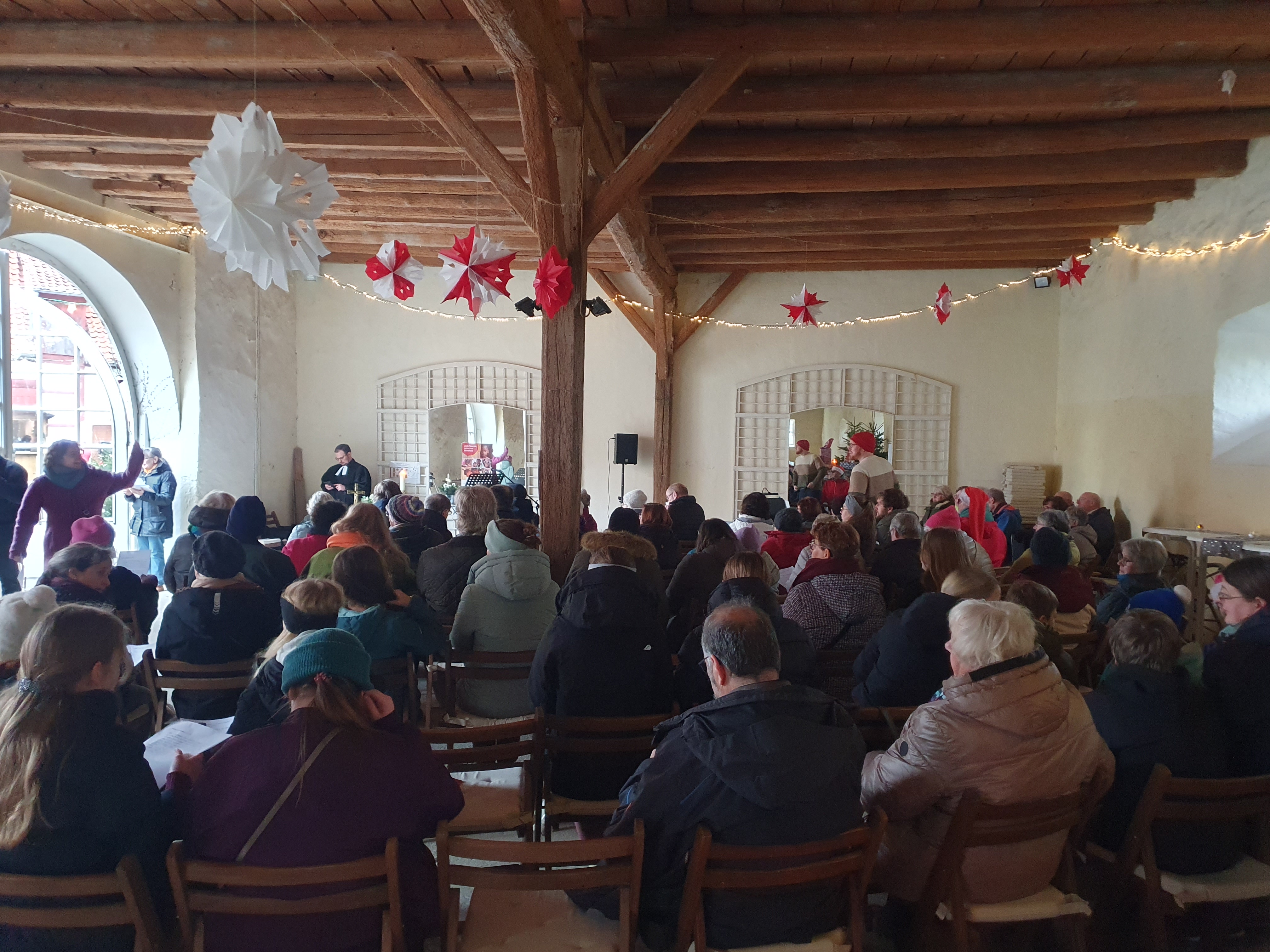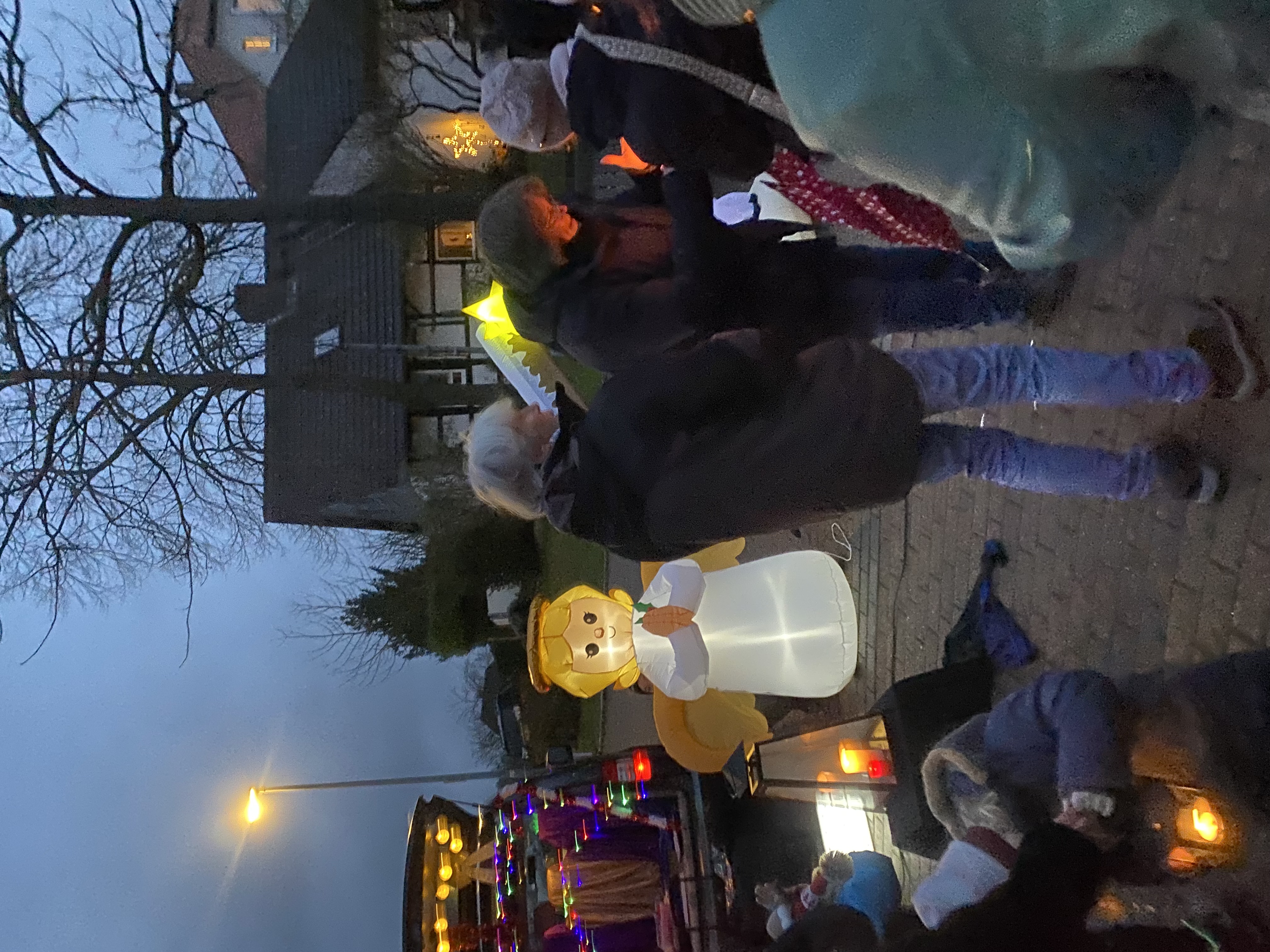 Kurz nach 16 Uhr am 3. Advent fährt der Adventsbully des KJD-Teams zu seiner 1. Station im Bergdorf Lüdersen auf dem Dorfplatz vor. Trotz Nieselregen und stürmischen Böen sind viele Kinder und Erwachsenen gekommen. Die Abenddämmerung hat längst eingesetzt. Und dann geht alles ganz schnell. Die Heckklappe öffnet sich und der Adventsbully erstrahlt auf einmal mit seinen kunterbunten Lichterketten den ganzen Dorfplatz. Hach, irgendwie magisch. Die drei Diakoninnen holen geschwind verschiedenste bunte und leuchtende Utensilien aus dem Bully. Was ist das eigentlich alles? Wir staunen. Ein buntes Paket wird plötzlich immer größer - es entpuppt sich als menschengroße aufblasbare Krippe. Ein anderes Paket ist ein großer aufblasbarer Engel. Wir sind überrascht und auch etwas verzaubert. Derweil frischt der Wind noch einmal so richtig doll auf. Aber das ist jetzt egal. Es wird improvisiert und alle packen mit an. Längst trällert die Adventsplaylist vom KJD über die Lautsprecher. Während die Einen sich schon gekonnt im Takt dazu bewegen, oder einfach nur mitsummen, halten die Anderen mit Händen und Füßen die Krippe & den Engel fest, so dass nichts wegfliegt. Wir sind verzaubert von dieser besonderen Stimmung.