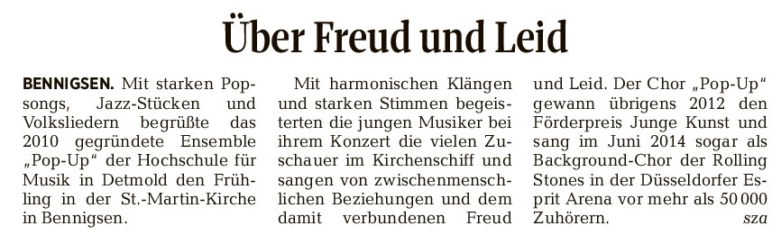 38 Teilnehmer, darunter Sänger der St.‐Martin‐Kantorei sowie Musikbegeisterte aus dem Stadtgebiet Springe und der Region Hannover, kamen in Bennigsen zu dem Jazz‐Chorworkshop mit Katharina Gärtner zusammen, um gemeinsam moderne Stücke zu singen. Organisiert wurde die Veranstaltung von Kirchenmusikerin Sabine Nauber, die Gärtner für den Kurs gewinnen konnte. „Ich bin von ihrer Energie und Fantasie begeistert.“