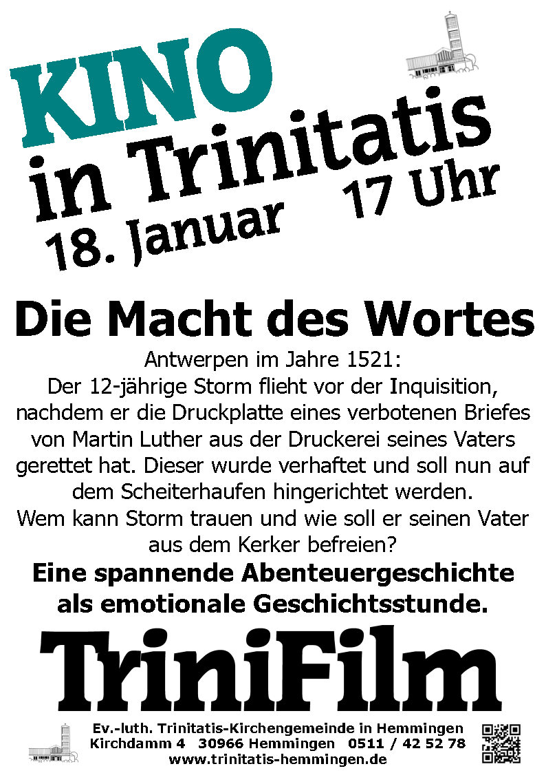 Trinitatis-Hemmingen - 15.10.2023  17 Uhr: TriniFilm - Kirchenkino in Trinitatis Die Kirchenkino-Reihe TriniFilm startet in die neue Saison. Am Sonntag, 15. Oktober zeigen wir um 17 Uhr im ...