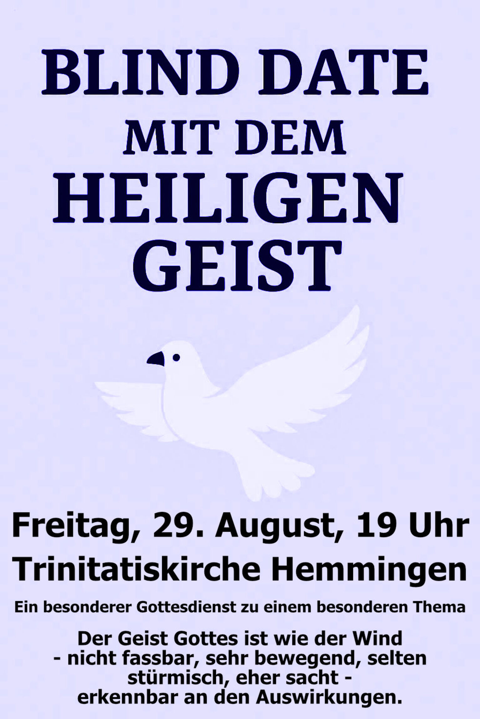Wo der Geist Gottes weht, ist Freiheit. Und in dieser Freiheit wird Begegnung möglich … bei einem Blind Date am 29. August um 19 Uhr in der Trinitatiskirche.