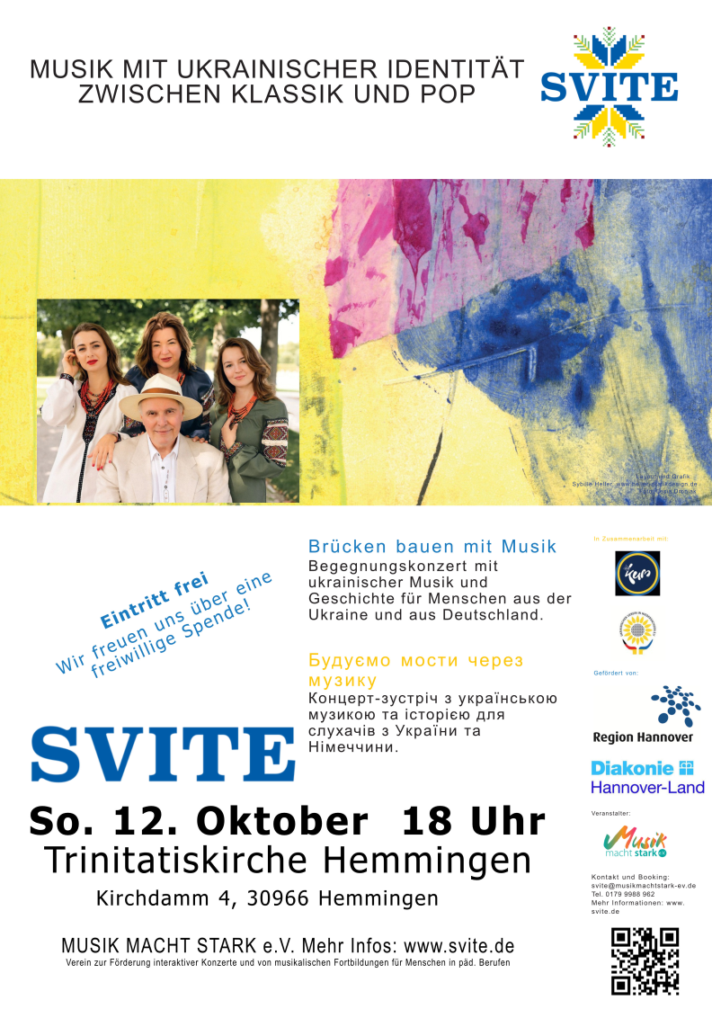 Musik gemeinsam zu erleben, kann eine Brücke zwischen den Welten schlagen, die sich doch so nah sind. Das ukrainisch-deutsche Ensemble SVITE präsentiert ein breites Spektrum ukrainischer Musik, die von mehrstimmigem Gesang, Bandura, Klavier und Akkordeon geprägt ist. Von traditionellen ukrainischen Volksliedern bis hin zu Interpretationen klassischer Werke ukrainischer Komponisten wird bewusst Vielfalt geboten. Auch die Popkultur findet ihren Platz, mit Liedern, die viele Menschen aus der Ukraine mitsingen können. Poetische Texte werden ins Deutsche übersetzt, während deutsche Lieder ins Ukrainische übertragen werden.